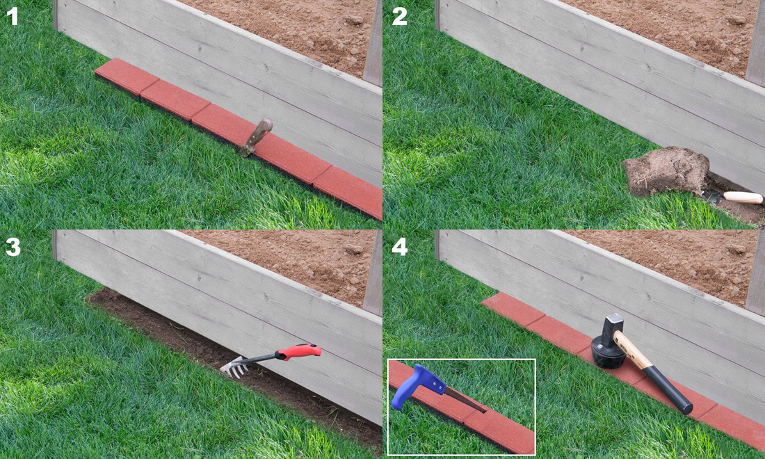 Die Verlegung der SECUPLAY Gummi-Mähkante ist sowohl bei Neuanlage der Garten-/Spielfläche, als auch bei nachträglichem Einbau äußerst einfach. An der entsprechenden Stelle einen 10cm breiten (für XL 20cm), ca. 3,6cm tiefen Graben herstellen (Bestandsrasen vorher mit Messer abschneiden), Untergrund etwas auflockern, SECUPLAY Gummi-Mähkante einsetzen und mit einem Gummihammer festklopfen. Schnitte können bei Bedarf mit einer normalen Holz-Handsäge durchgeführt werden.